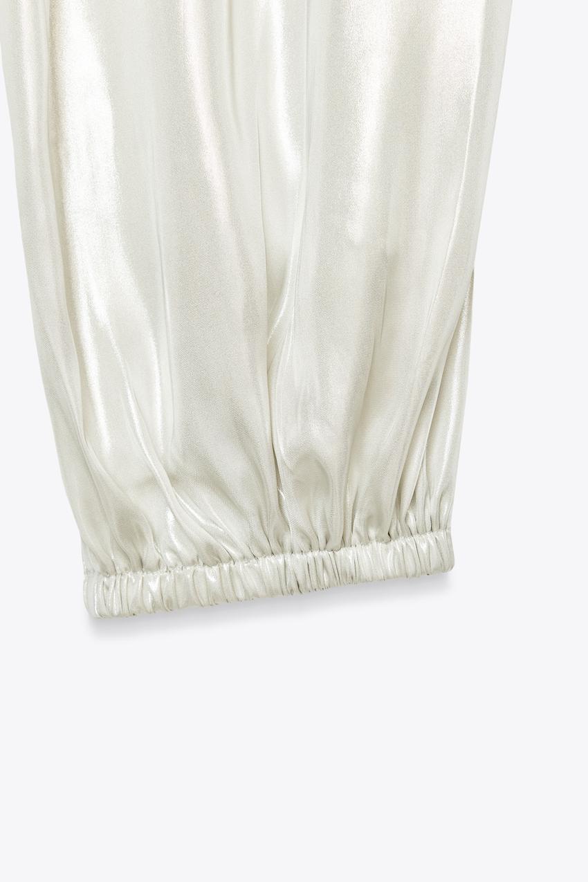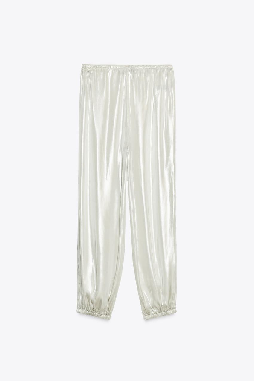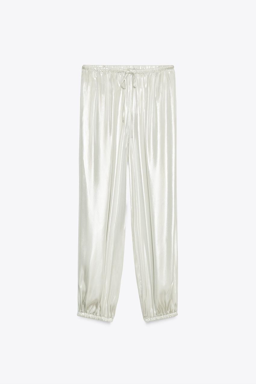 Брюки-бананы со средней посадкой, эластичным поясом, регулируемым шнурком, присборенным низом и эластичными манжетами. Описание сгенерировано ИИ, поэтому может содержать неточности.