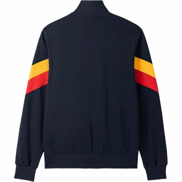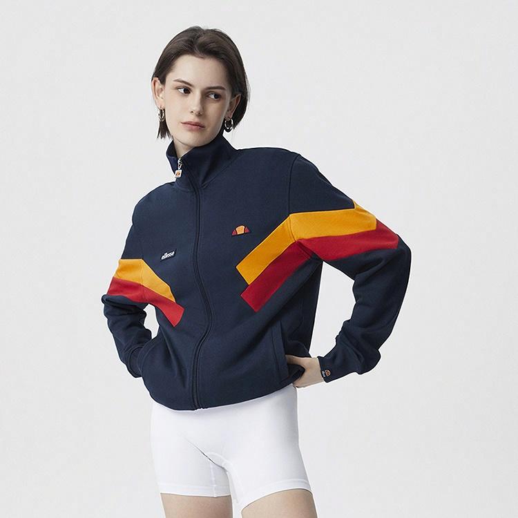 ellesse small shell workwear embroidery Logo patch thin vintage sport casual American baseball jacket with color-blocked stripes, stand-up collar, contrast half-high collar, soft knitted jacket, unisex, navy blue