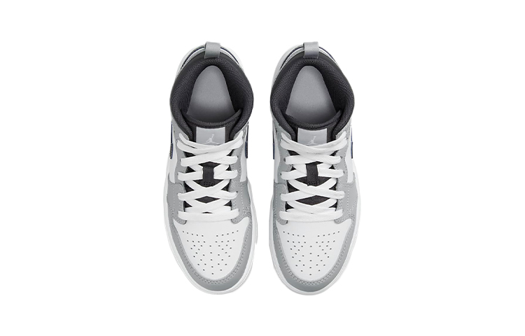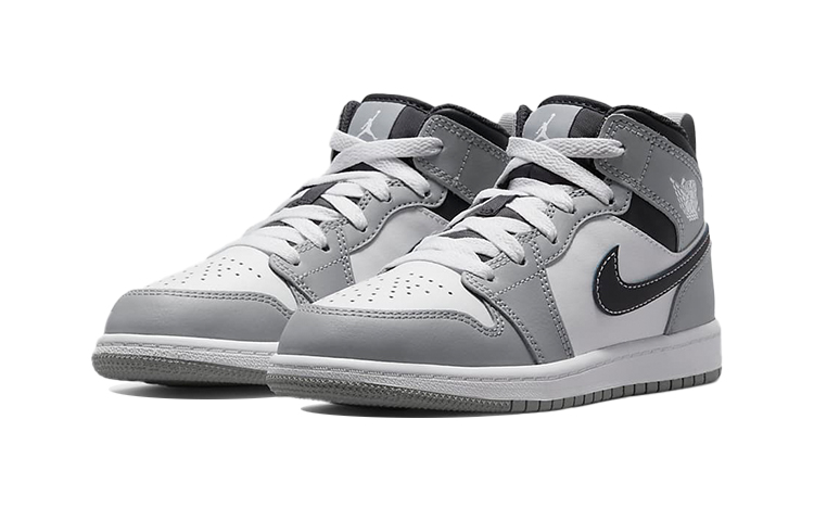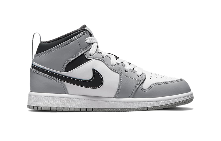 Кроссовки Jordan 1 Mid Light Smoke Grey (2022) (PS) - стильная и удобная обувь для детей. Дизайн выполнен в светло-серых тонах с черными и белыми акцентами. Верх изготовлен из прочного материала, подошва обеспечивает отличное сцепление с поверхностью. Идеальный выбор для активного образа жизни вашего малыша. Описание сгенерировано ИИ, поэтому может содержать неточности.